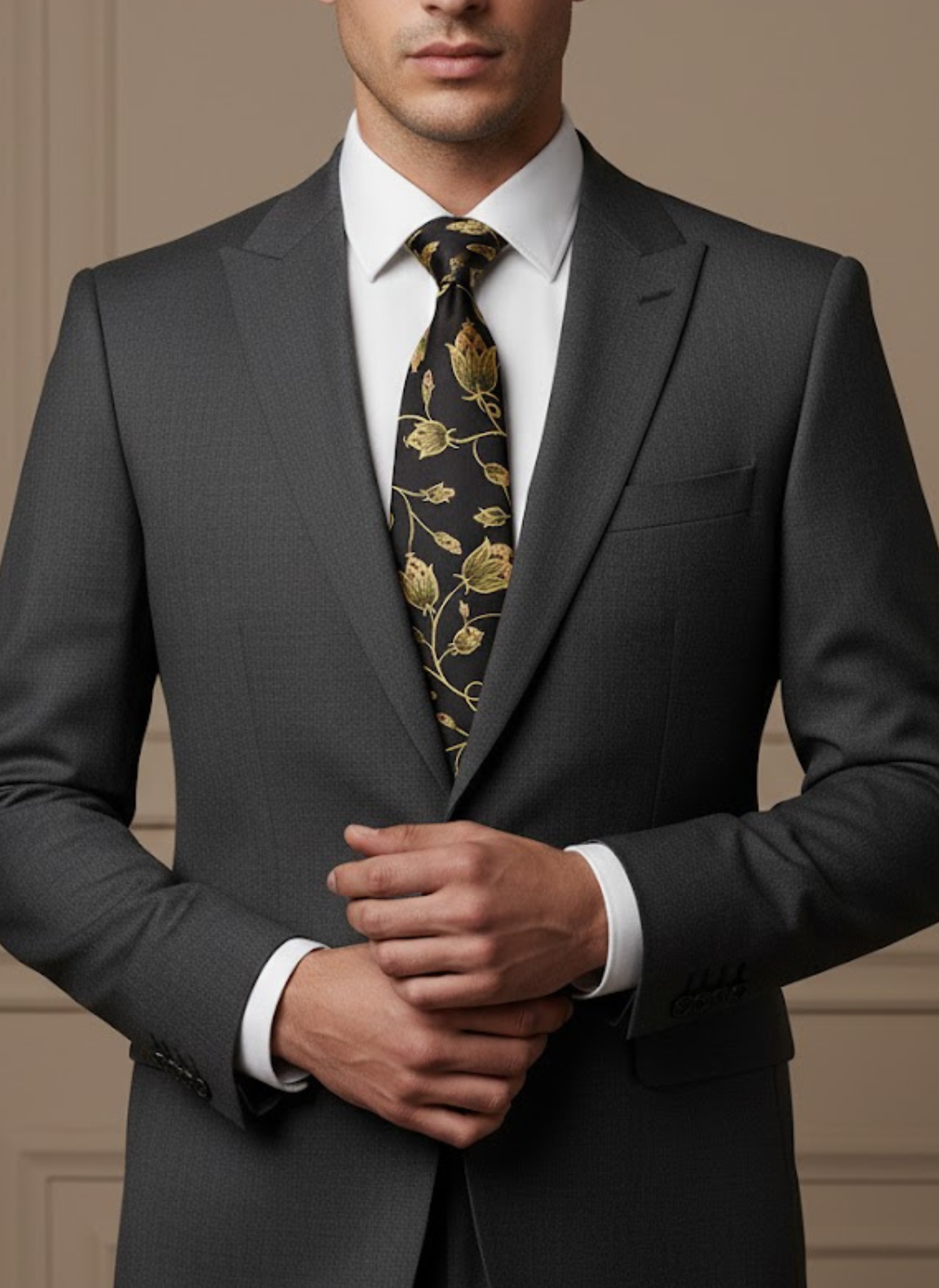 Introducing the Golden Floral Silk Tie in Black from Bux’s latest wedding collection. Handmade with 100% silk, this tie is a versatile accessory suitable for all four seasons. The delicate floral design in golden and pink against jet black exudes decadence and romance. Elevate your outfit and shine on special occasions such as weddings, anniversaries, and date nights with this beautiful accessory.