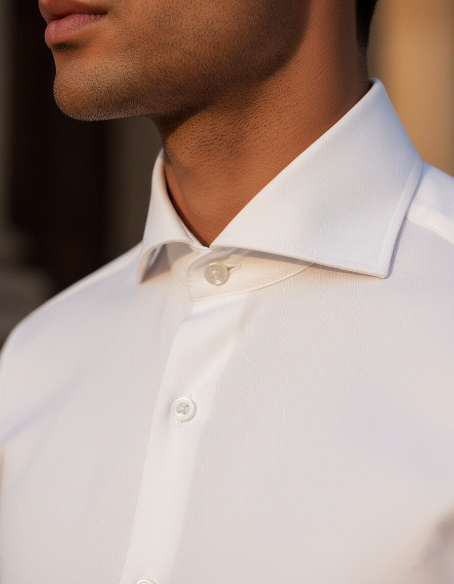 A modern interpretation of the classic white dress shirt. Crafted from high-performance fine twill cotton, it offers a smooth texture and an impeccable drape. The extreme cutaway collar adds a bold, contemporary edge to formal styling, while the classic fit ensures enduring comfort. Designed to pair seamlessly with a suit and tie, this shirt defines understated sophistication.