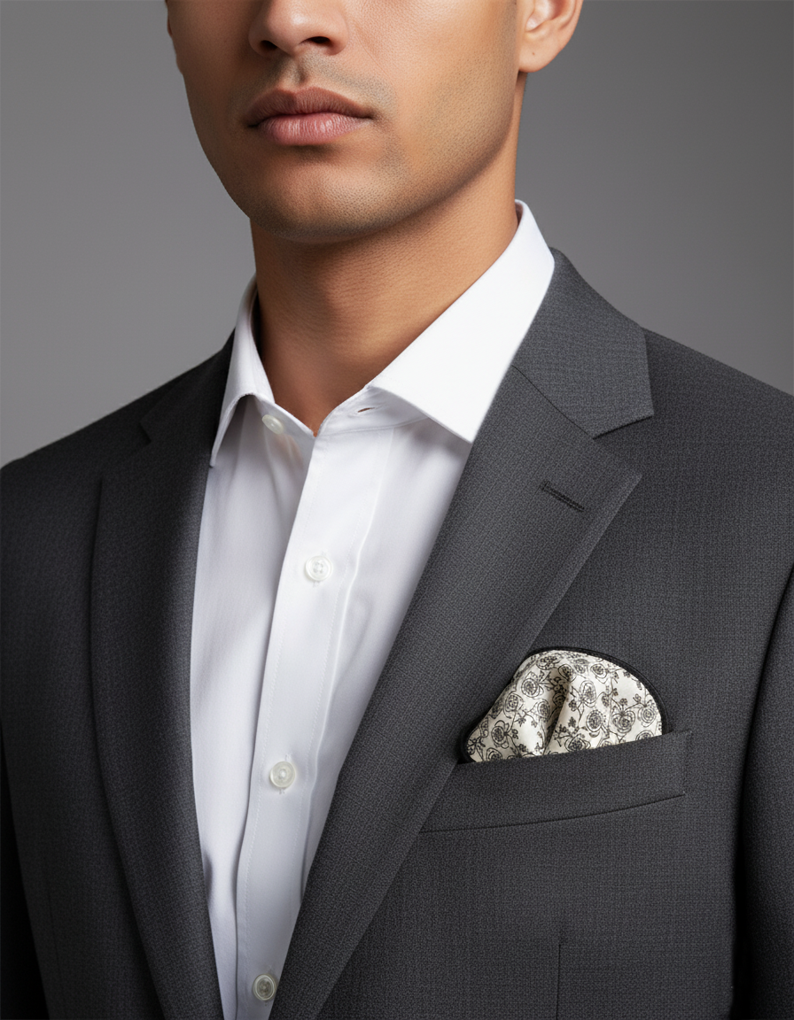 Elevate your outfit with our White Floral Pocket Square, crafted from 100% handmade cotton. Its refined black and white floral accents make it the perfect accessory for both office wear and semi-formal occasions. Pair it with a crisp button-up for a timeless uptown look.
